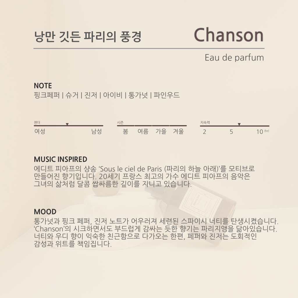 음악향수 장르라인은 음악 장르마다의 매력을 향기로 담아 낸 스페셜 향기 라인으로 향기와 멜로디의 조화로운 포뮬러가 전하는 특별한 어코드를 만나 보실 수 있습니다.